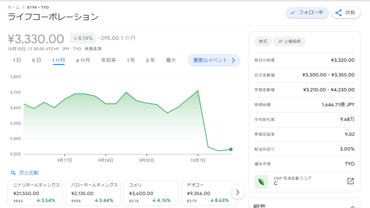 今回の学びとして、「決算後、良い内容が含まれていても株価が下がることもある」というのを、初心者として心に留めておきたいと思います。そしてライフは大好きなので応援していきたいです。