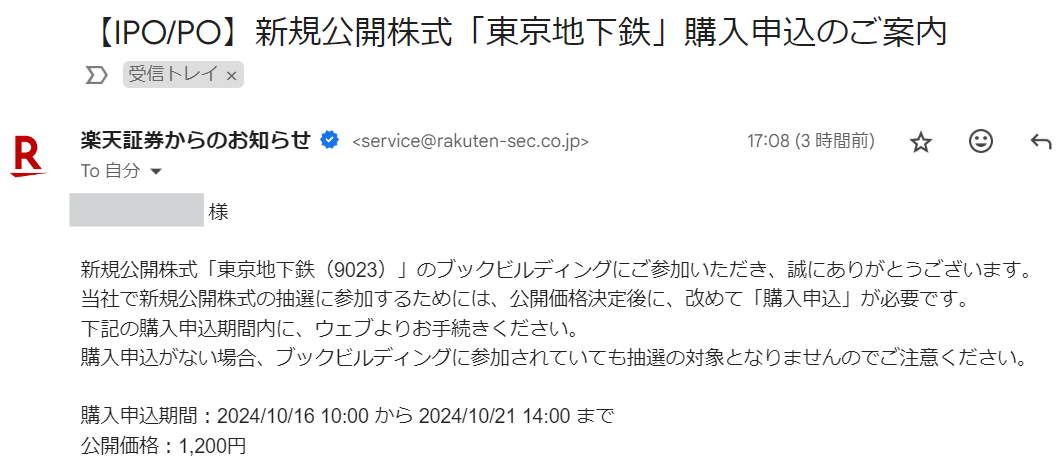 先日申し込んだ東京地下鉄のIPO(新規公開株)についてメールが届きました。